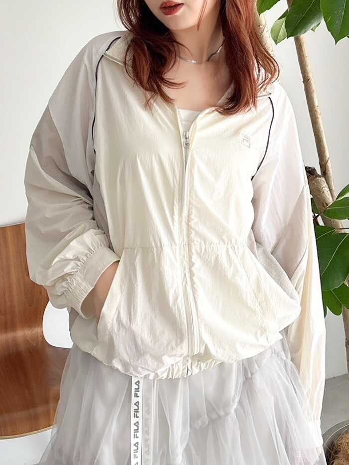 「【FILA別注】バイカラースイッチングミドルブルゾン」(15,950円/税込)は、アイボリー・グレー・ブラウンの3色展開、サイズ S・M。