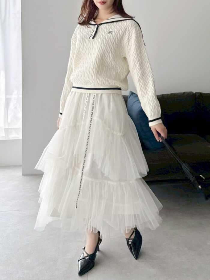 「アシメチュールティアードスカート」(14,300円)はオフホワイト・グレー・ブラック、サイズ S・M。軽やかなチュールとFILAロゴ入りテープベルトで甘さとスポーツ感をバランス良くミックス。