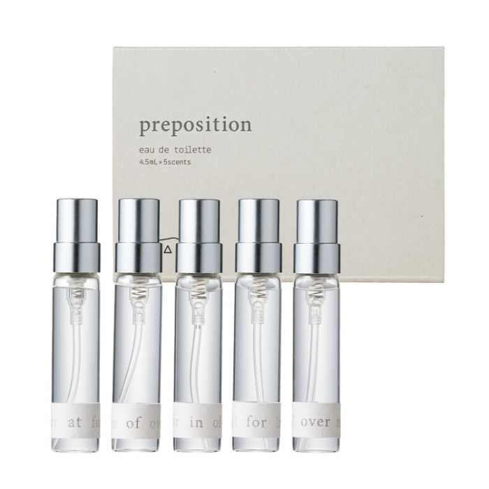 さらに、既存ライン「オードトワレ 全5種」(各6,600円・45mL)や、5種セット「preposition」(6,600円)も登場。