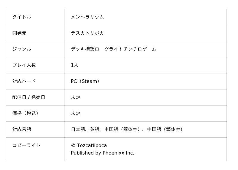 株式会社Phoenixx(フィーニックス)(東京都武蔵野市、代表取締役社長:坂本 和則)は、デッキ構築ローグライクチンチロゲーム『メンヘラリウム』について、2025年10月14日(火)~21日(火)にSteamにて開催される「Steam Next Fest」に参加すると共に、「Steam Next Fest」に先行し、日本時間の2025年10月11日(土) 0時より、体験版を初公開することに決定いたしました。