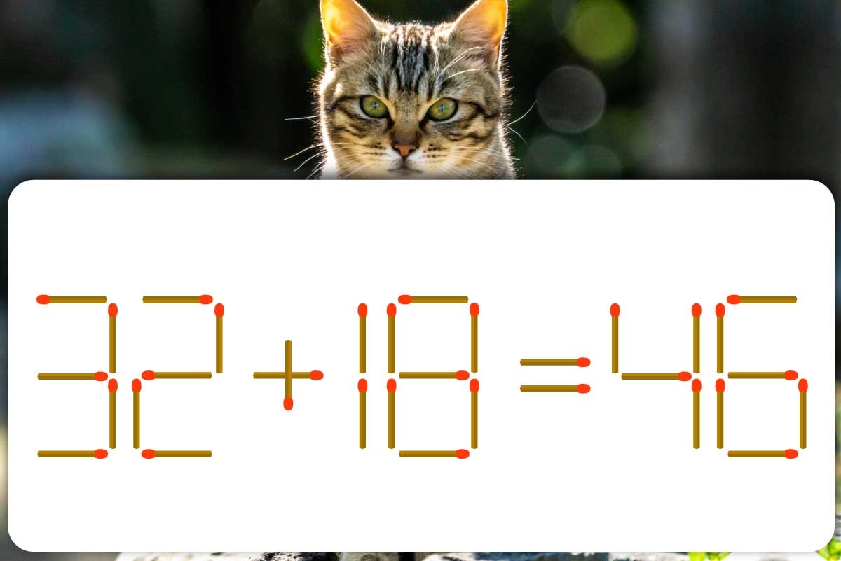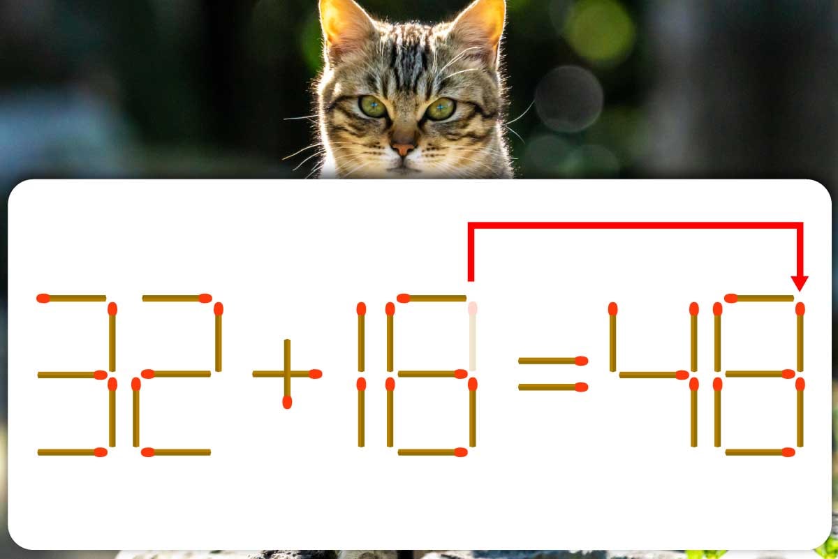 「18」から「8」の右上にある縦向きのマッチ棒を取り除き「16」にします。このマッチ棒を答えの「46」にある「6」の右上に足すと「48」に変化します。これにて「32+16=48」となり、式と答えが一致しました!