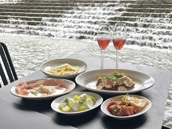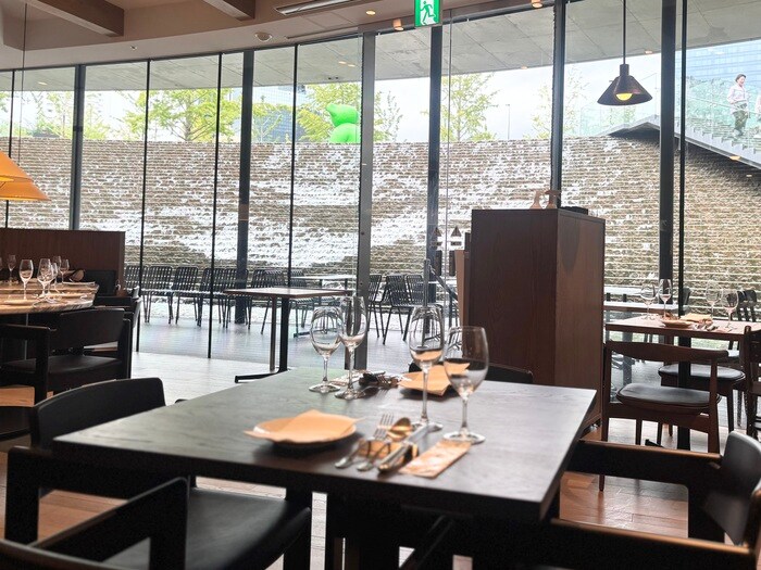 柔らかな光溢れる店内は広々としており、窓からは水のせせらぎと、うめきた広場が望め開放感が溢れています。お買い物中のランチやオフィス帰りのディナー、女子会など、さまざまなシーンで活躍。おしゃれで気軽に利用できる空間です。