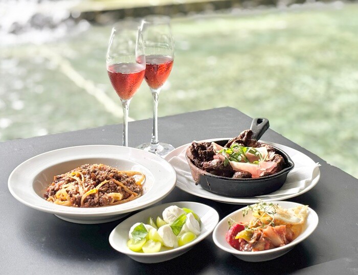日本各地から取り寄せた旬の食材を使用した、彩り豊かなアペタイザーやメインディッシュと共にワインで乾杯、「ふくどめ小牧場」自慢の生ハムを添えた仔牛のカツレツに京都岡牛を使用したグリルステーキなどの、メインディッシュも登場、地域の食材も積極的に取り入れており、地域ならではの素材の魅力を味わうことができます。