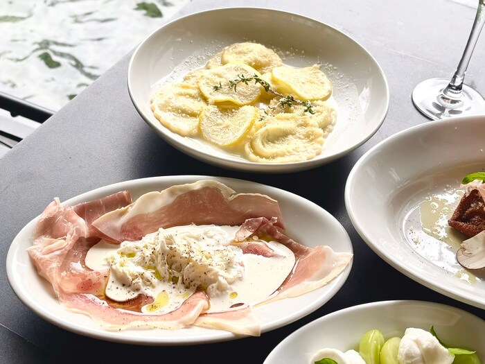 GOOD CHEESE LABORATORY の作りたてフレッシュチーズと、もちもち食感の手打ちパスタが魅力の一皿です。