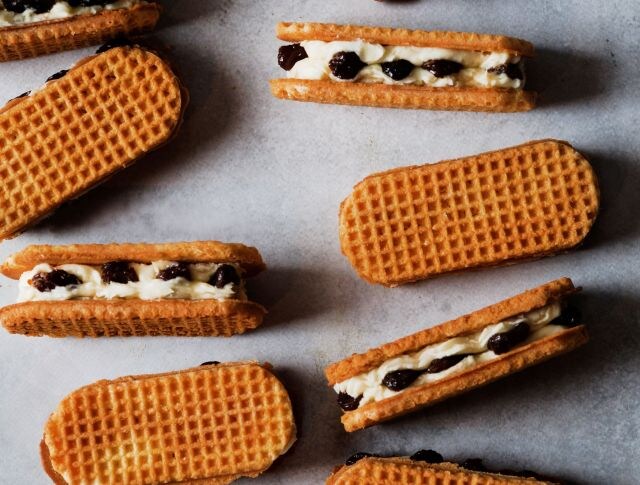 手焼きのクッキー生地にバタークリームを絞り、レーズンを並べてサンドするまで、すべての工程を手作業で行います。手作業だからこその味わいや食感を楽しめるのがポイント。