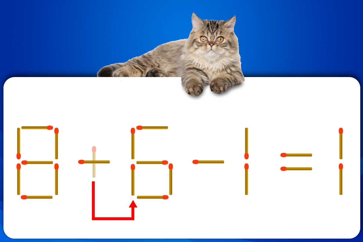 「+」のマッチ棒を1本、「5」に移動させて「6」を作り「8-6-1=1」にする。※解答は複数ある場合があります。