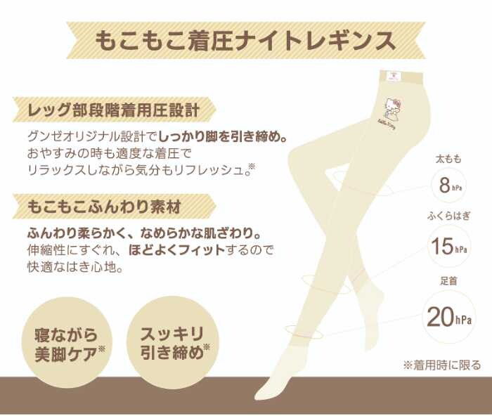ハローキティとポチャッコの可愛いデザインで心も癒されつつ、グンゼオリジナルの段階着用圧設計で脚やお腹をしっかりサポート♡
