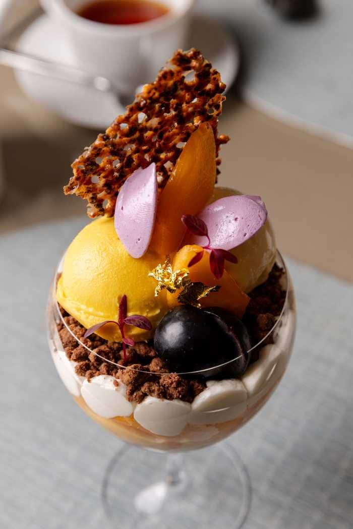 葡萄と柿の実りに、カボチャとクリームのまろやかさ、ラムとシナモンの香りが調和する、まさに“秋の贅沢”と呼ぶにふさわしいパフェ。
