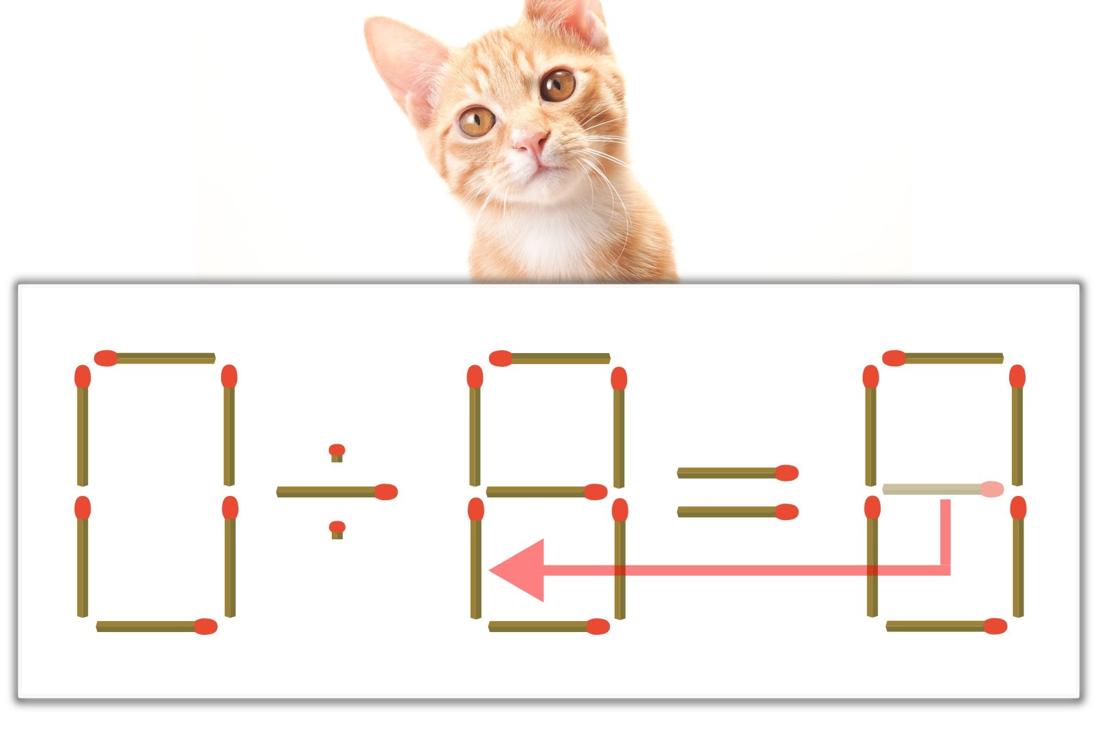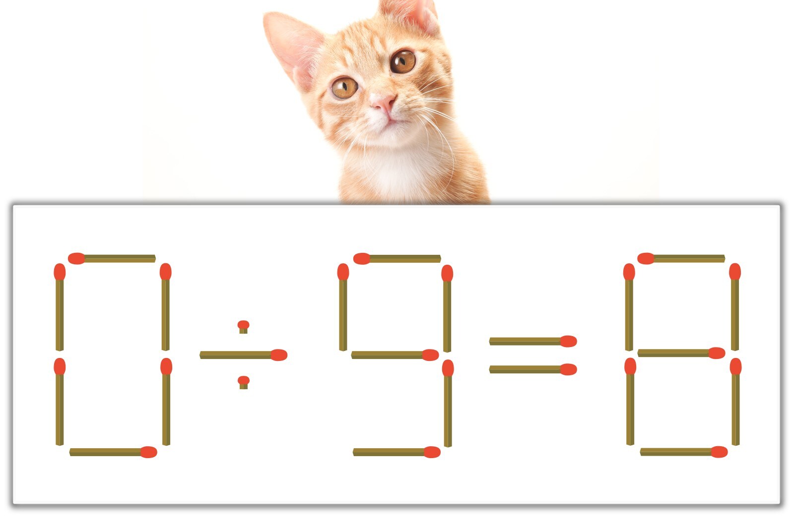 「8」のマッチ棒を1本、左にスライドさせて「8」を作り、「0÷8=0」にする。※解答は複数ある場合があります。