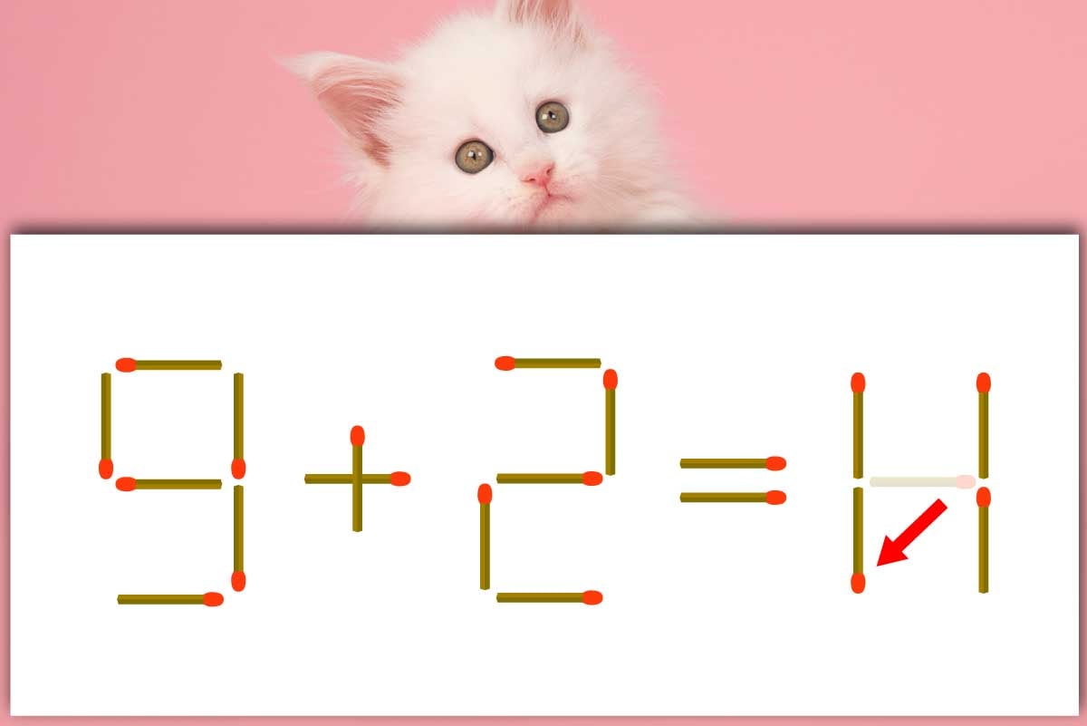 まず、「4」の真ん中にある横向きのマッチ棒を取ります。取ったマッチ棒を縦に回転させ、「4」の左下にくっつけましょう。すると、「11」に変化!これにより、式が「9+2=11」となり、正しくなりました。