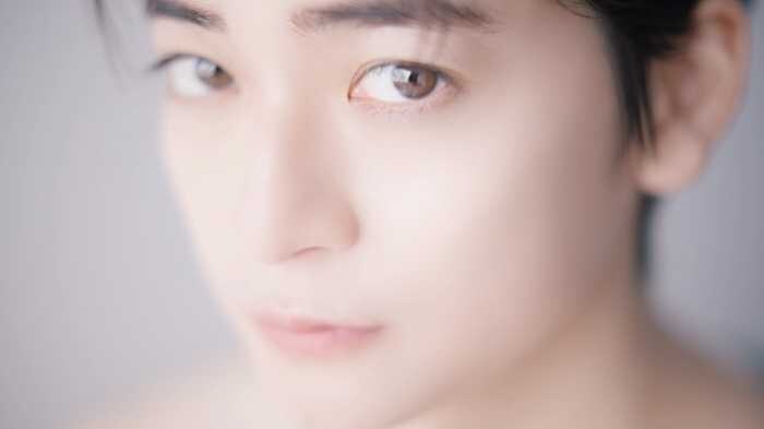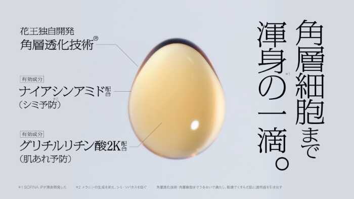 透明な琥珀色の美容液が滴る美しい映像と共に、真摯なまなざしで商品の魅力を表現しています。