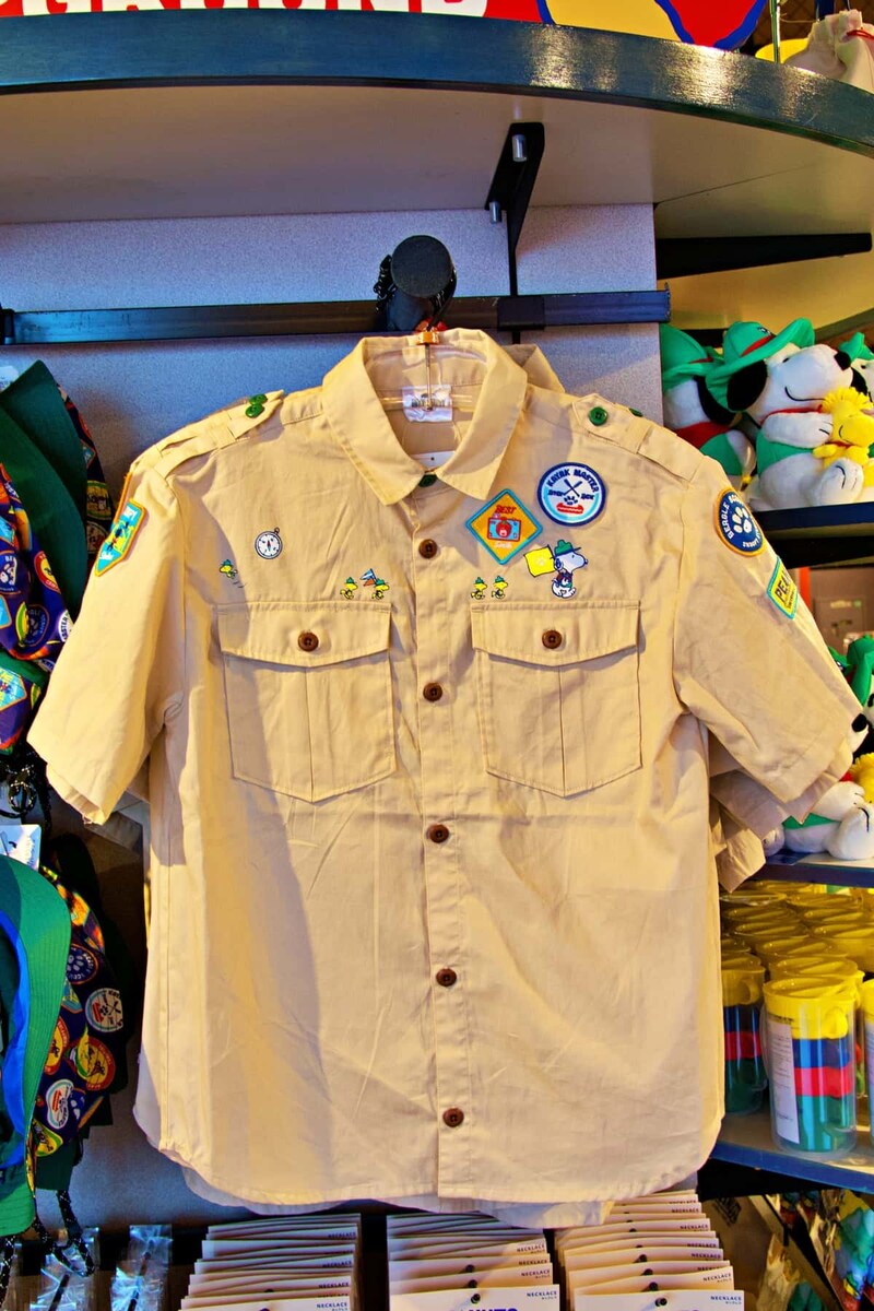 「ビーグル・スカウト」をイメージしたワッペンがポイントのシャツ。「さぁ冒険に出発だ!」と、ウッドストックと仲良く行進するスヌーピーたちがかわいすぎます!