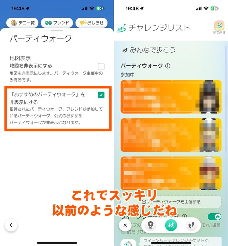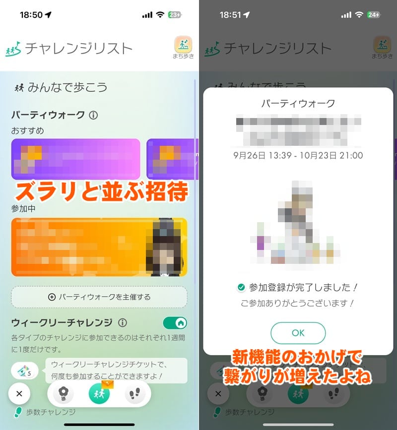 世界中のプレイヤーが主催するものに参加できるようになり、“おすすめ”には現在進行形のパーティウォークが連日ピックアップされている。
