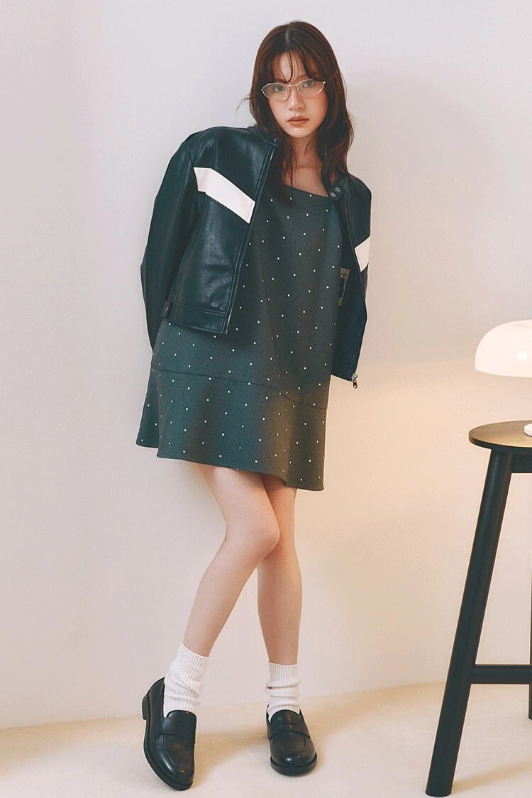 さりげない立体感と上品な艶のあるドットが魅力のワンピース。短すぎないショート丈のレザージャケットを羽織れば、こなれたカジュアルスタイルの完成。