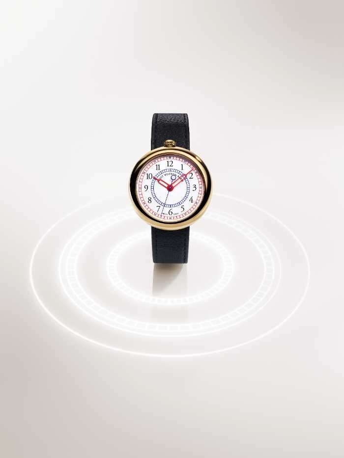 ホワイトのグラン・フー エナメルダイヤルには、赤と青のアクセントが映え、シンプルでありながら圧倒的な存在感を放ちます。