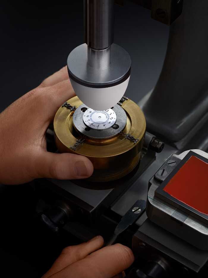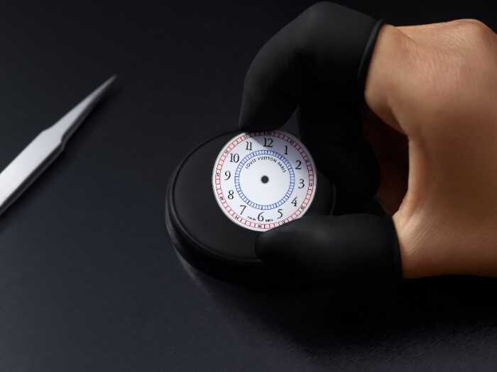 グラン・フー エナメルのダイヤルは、約20時間にも及ぶ多層焼成によって生み出されるルイ・ヴィトンの至高の技。透明感のある光沢と奥行きのある白色は、見る角度によって異なる輝きを放ちます。