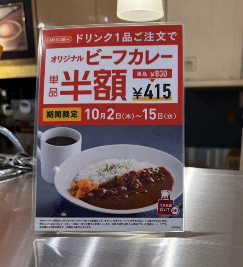 コーヒーショップチェーンのカフェベローチェでは、10月2日よりドリンク1品注文するとビーフカレー単品が半額になるというキャンペーンを行っている。