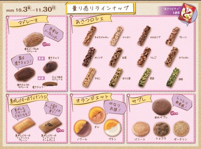 ほかにも、外はさっくり、中はしっとりとした独特な食感が楽しい「ぬれサブレ」や、UHA味覚糖の代表的なスナック「おさつどきっ」を使った「おさつロシェ」など、バラエティに富んだ商品がそろいます。