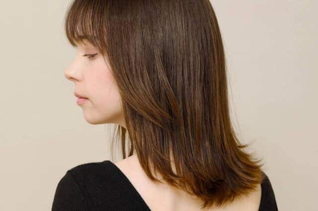 毛先を外ハネにして下方向の動きをつけると、自然に縦長のシルエットが完成。顔まわりにレイヤーを入れるだけで、首元に抜け感が出て、全体がすっきり見えます。