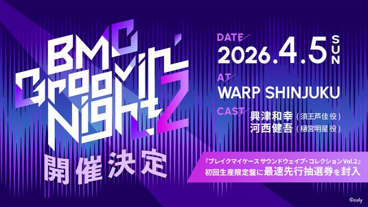 この度、2026年4月5日(日)に、本作2回目となるDJイベント『BMC Groovin' Night2』を開催することが決定いたしました。ゲストに須王芦佳役の興津和幸さん、樋宮明星役の河西健吾さんなどをお呼びして、ブレマイの音楽と世界観を楽しむイベントです。