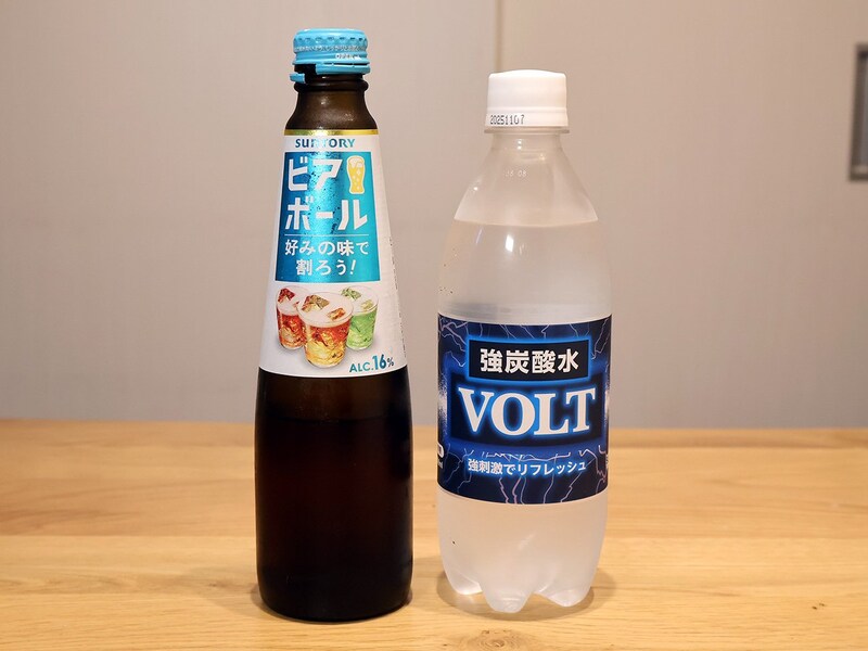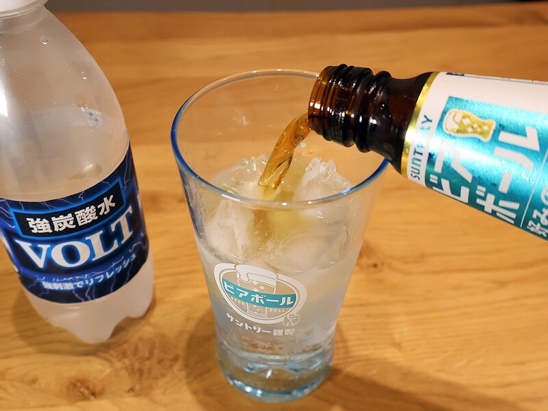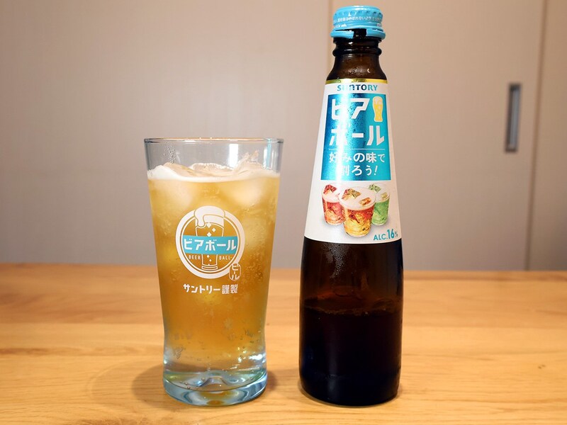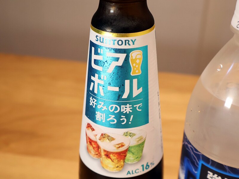 ベースとして使うのはサントリーの「ビアボール」。こちらは2022年に発売された商品で、中身は実質ビールの原液みたいなもの。アルコール度数は16%と高く、炭酸水で自分好みの濃さに薄めて飲みます。