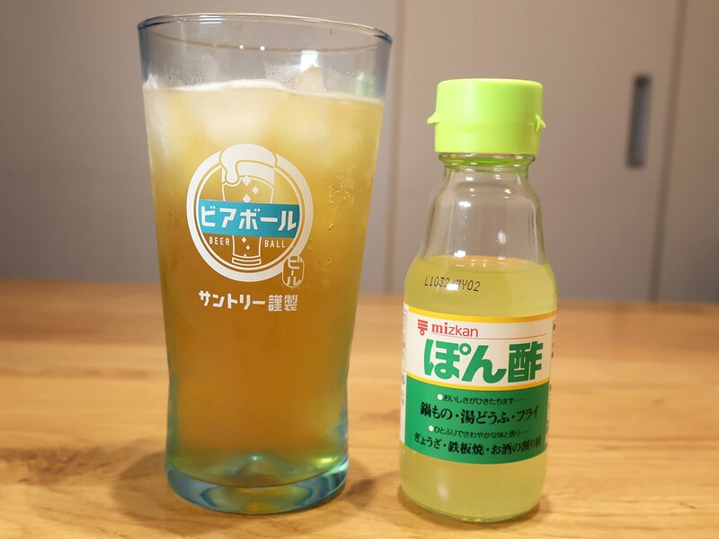 ぽん酢は柑橘類と酢でできているので、アルコールとの相性が抜群。酒場で近年「ぽん酢サワー」がブームとなったことで酒の割り材としても認知され始め、ついにラベルにも「お酒の割り材」と記されるようになりました。
