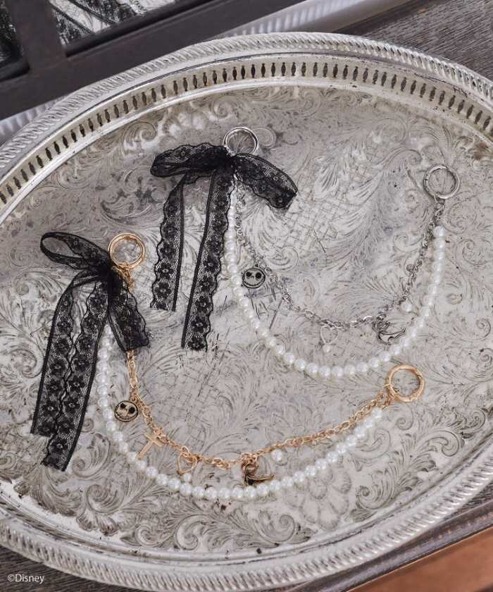 レースリボンとパールを組み合わせた「ナイトメア/レースリボン付チャーム」(税込¥2,499)は、フェミニンな印象でデイリー使いにもぴったり。