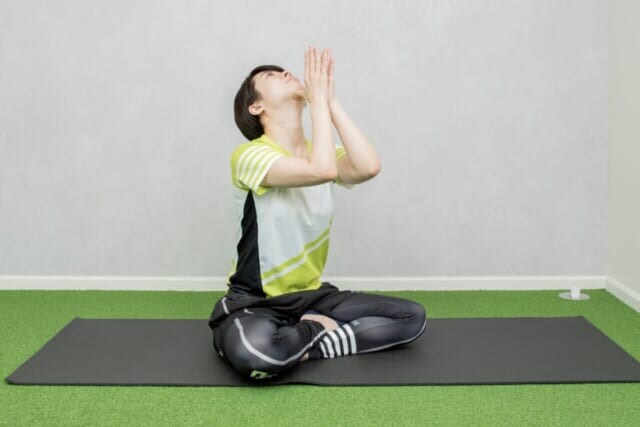 (1)あぐら座りをして両手のひらを合わせ、両親指の上に顎をのせる