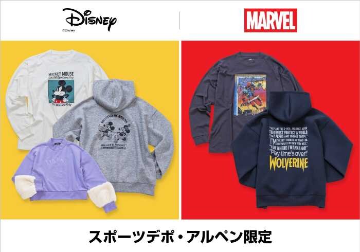 スポーツ用品のアルペンから、ディズニー&マーベルの2025年秋冬コレクションが登場!スポーツデポ・アルペン限定のラインナップには、ビンテージテイストのディズニーキャラクターや、大胆なマーベルロゴが魅力のウェアが勢ぞろい。保温性・ストレッチ性に優れたスウェット素材や、乾きやすいコットンなど、秋冬のデイリースタイルを快適に彩るアイテムが満載です♡