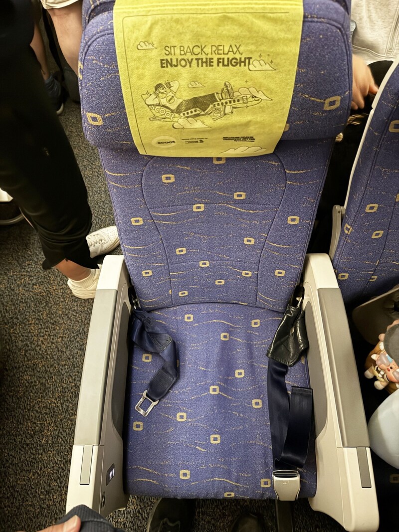 ということで、実際に乗ってみた。中央部の通路側である。水分を摂りすぎたため、トイレに何度も行きそうだったので、トレイが比較的近い座席を指定した。しかしトイレに近すぎるニオイが気になるので、近すぎない中央部の通路側を指定。