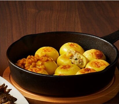 【阪神初出品】「餃彩(チャイ)」の「こんがりバター醬油とうもろこし餃子(6個/810円)※実演