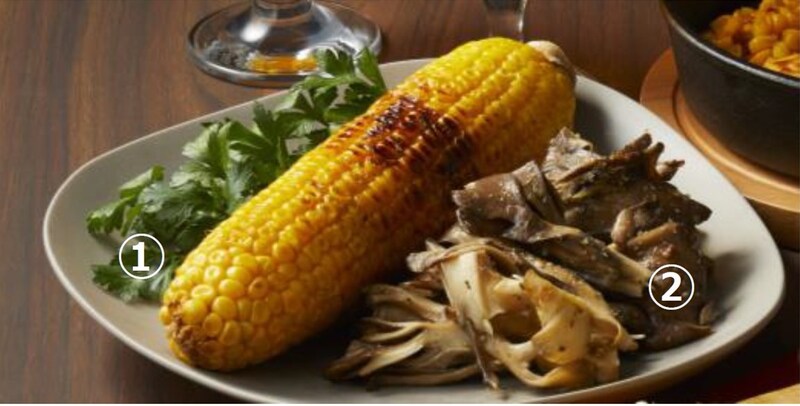 左から、「帯広串〇」の「とうきび」(1串/540円)※実演、「サッポロビール園」の「ジャンボ舞茸のガーリックソテー」(1人前/770円)※実演