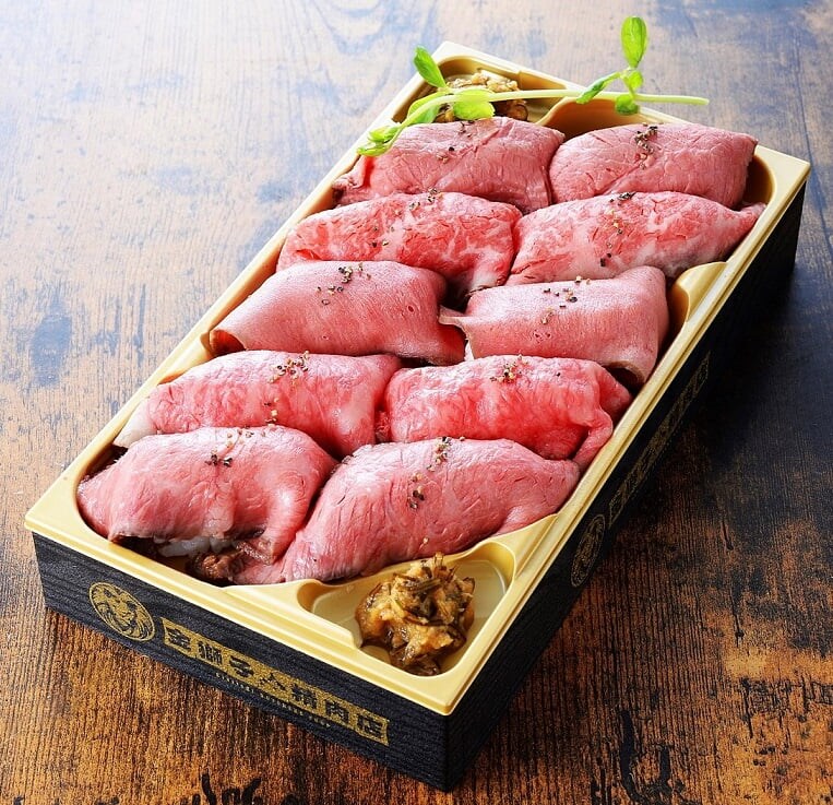 「金獅子精肉店」の「北海道産牛一頭食い肉寿司」(10貫/2,430円)※実演