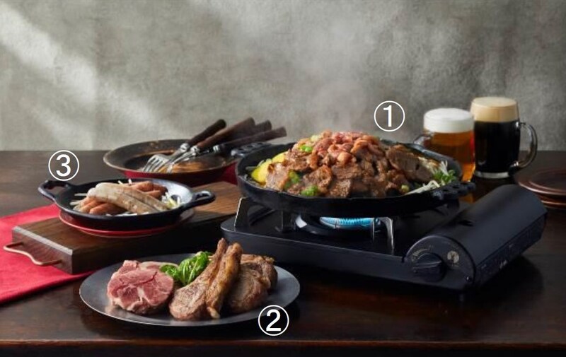 右から「サッポロビール園」の「サッポロビール園自慢のラムジンギスカン〈味付け〉」(1人前/1,320円)、「豪快にかぶりつけ! ラムチョップ」(1本/1,100円)、「オリジナルラムソーセージ」(2本/550円)※実演