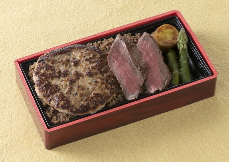「八軒苑」の「北海道産牛ヒレステーキ×肉問屋のハンバーグ弁当」※実演