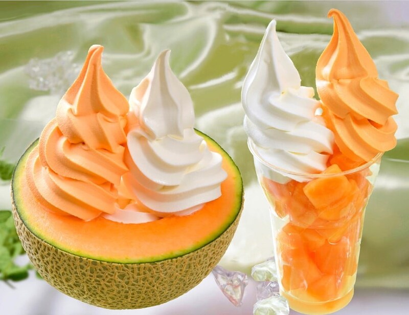 左から、「札幌やおきゅう」の「生メロンソフトクリームダブル」(1個/1,980円)※各日販売予定数50、「生メロンパフェダブル」(1個/1,320円)※各日販売予定数50、いずれも実演