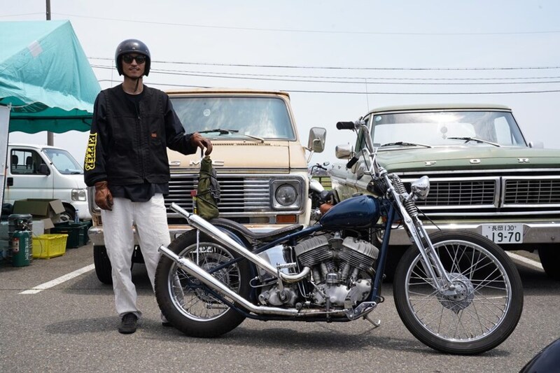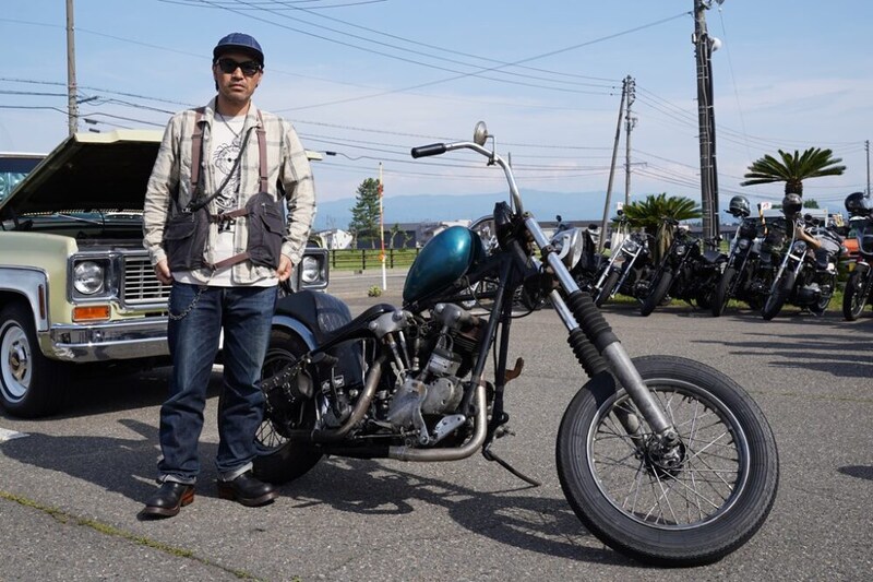 サイドバルブの希少種であるUHをチョッパーにした超クールな一台。フルレストアを行ない。シンプルンプルなチョッパーを目指したという。着こなしはブルコのベストを使ったストリート感あるスタイリングで雰囲気たっぷり!