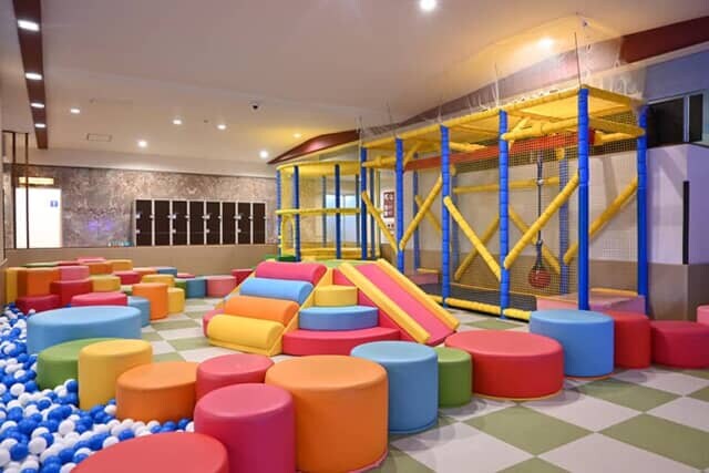 7時から24時まで利用できる「キッズコーナー」にはボールプールや滑り台などを設置。2階のレストラン前にはボルダリングコーナーもあって、子供に優しいホテルです。