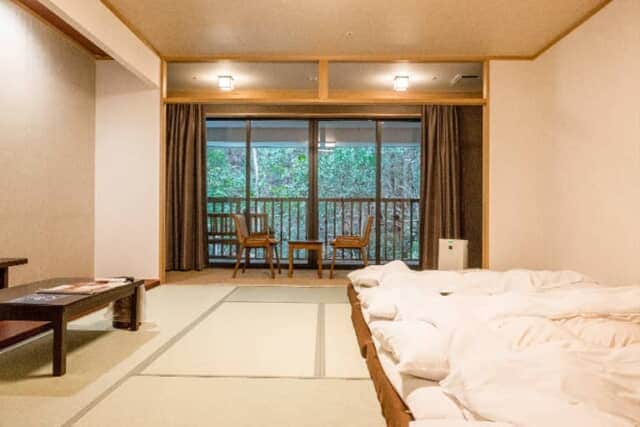 4人まで利用できるゆとりのある客室には、広縁とベランダをそなえます。和室はチェックイン時に布団が敷かれているので、いつでも横になることができました。家族連れやグループ旅行におすすめです。