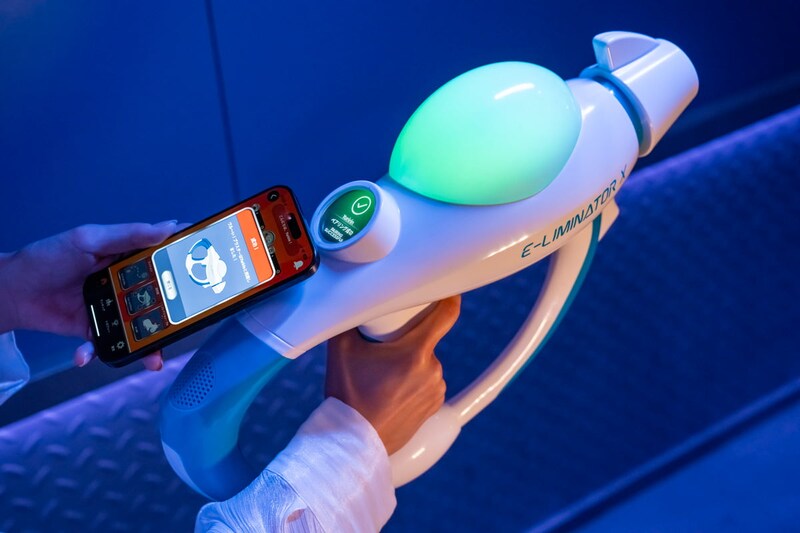 最新鋭のブラスター「イーリミネーターX」(電気銃)を手にムービング・ウォークウェイに乗りこみ、パークのアトラクションに初登場となるスーパー悪党グループ「ヴィシャス6」の新メンバーになるため、高得点を目指してシューティングの腕を競います。