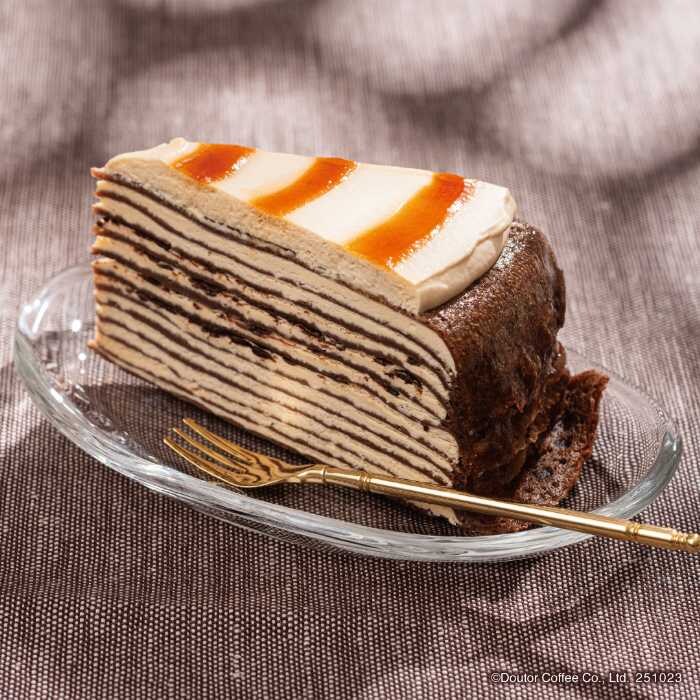 ショコラクレープ生地の間に、パリパリ食感のチョコとキャラメル風味ホイップクリームを重ね、甘さとほろ苦さの絶妙なバランスが魅力。