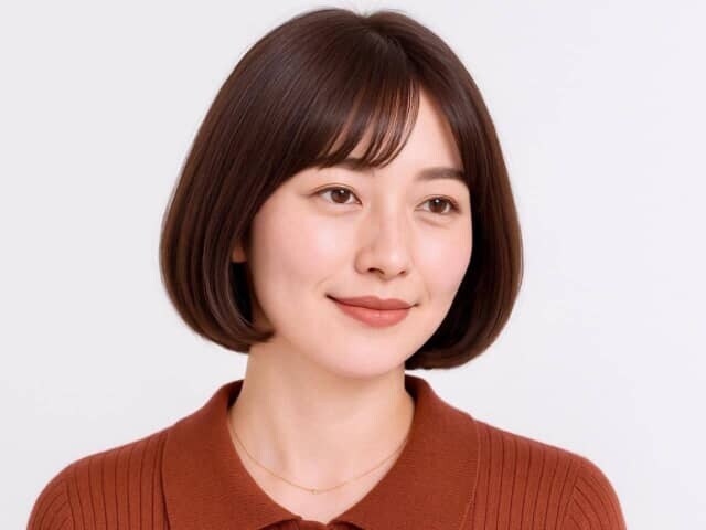 ストレートヘアは清潔感がありつつも、のっぺり見えしやすいのが悩み。おすすめは、毛先に自然なカールを加えた“前下がりボブ”です。丸みを持たせることで顔まわりが優しく見え、フェミニンな印象を演出します。