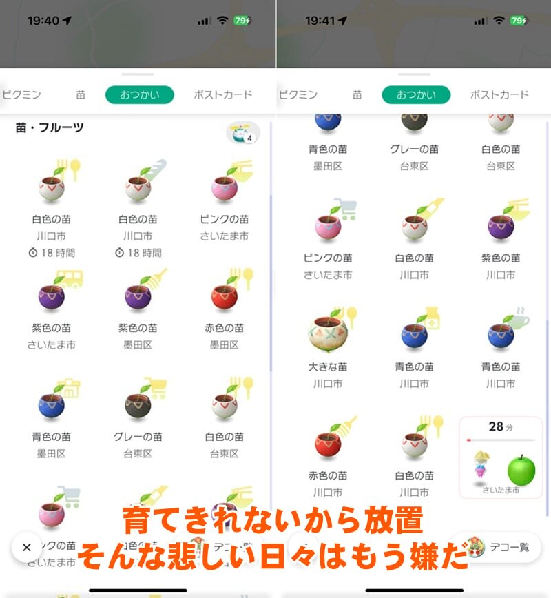 常設のスポット系に関しては、遊んでいればいずれコンプリートできるだろうというマイペースなプレイスタイルなので、苗の育成率はそんなに多いほうじゃない。