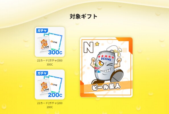 21LIVEでおなじみの「オキコレ」シリーズから登場する『ビール星人』を、300ガチャ・200ガチャで集めて豪華プライズをゲットしましょう。