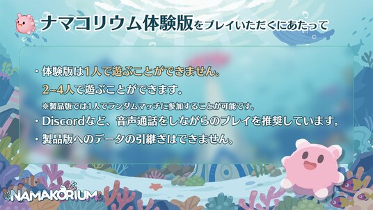 NAMAKORIUM(ナマコリウム)体験版では、2つのステージを最大4人のマルチプレイで遊ぶことができます。体験版では1人で遊ぶことができず、参加コードを共有できる2人以上のプレイヤーが必要となります。また、NAMAKORIUM体験版を扱った配信・動画投稿は大歓迎、配信禁止区間はなく、収益化も問題ありません。配信時は、概要欄にSteamストアページのリンクを記載ください。