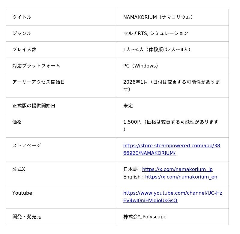 「未来を、前倒す。」をミッションとする株式会社Polyscape(本社:東京都港区、代表取締役:島田寛基、以下「当社」)は、日本時間の2025年10月14日(火)午前2時から開催される「Steam Next フェス10月エディション」の出展に合わせて、現在開発中のPC用ゲーム、海の掃除屋ナマコが主役のカジュアルマルチプレイRTS「NAMAKORIUM(ナマコリウム)」の体験版の配布を開始し、体験版発表記念トレーラーを公開いたします。