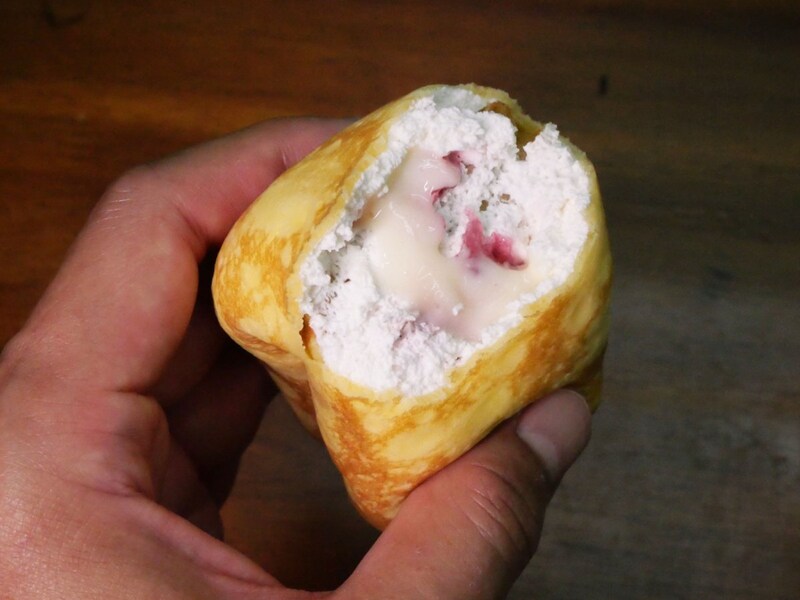 さっそく食べてみます。これ完全にアタリでした。まず、半分に割ってみると、大量の「森永加糖れん乳クリーム」とソースが含まれていることか目視で確認できます。かなり大量です。クレープ生地がやぶけたとたん、「ようやく解放された!!」と言わんばかりに、クリームがあふれ出たのです。