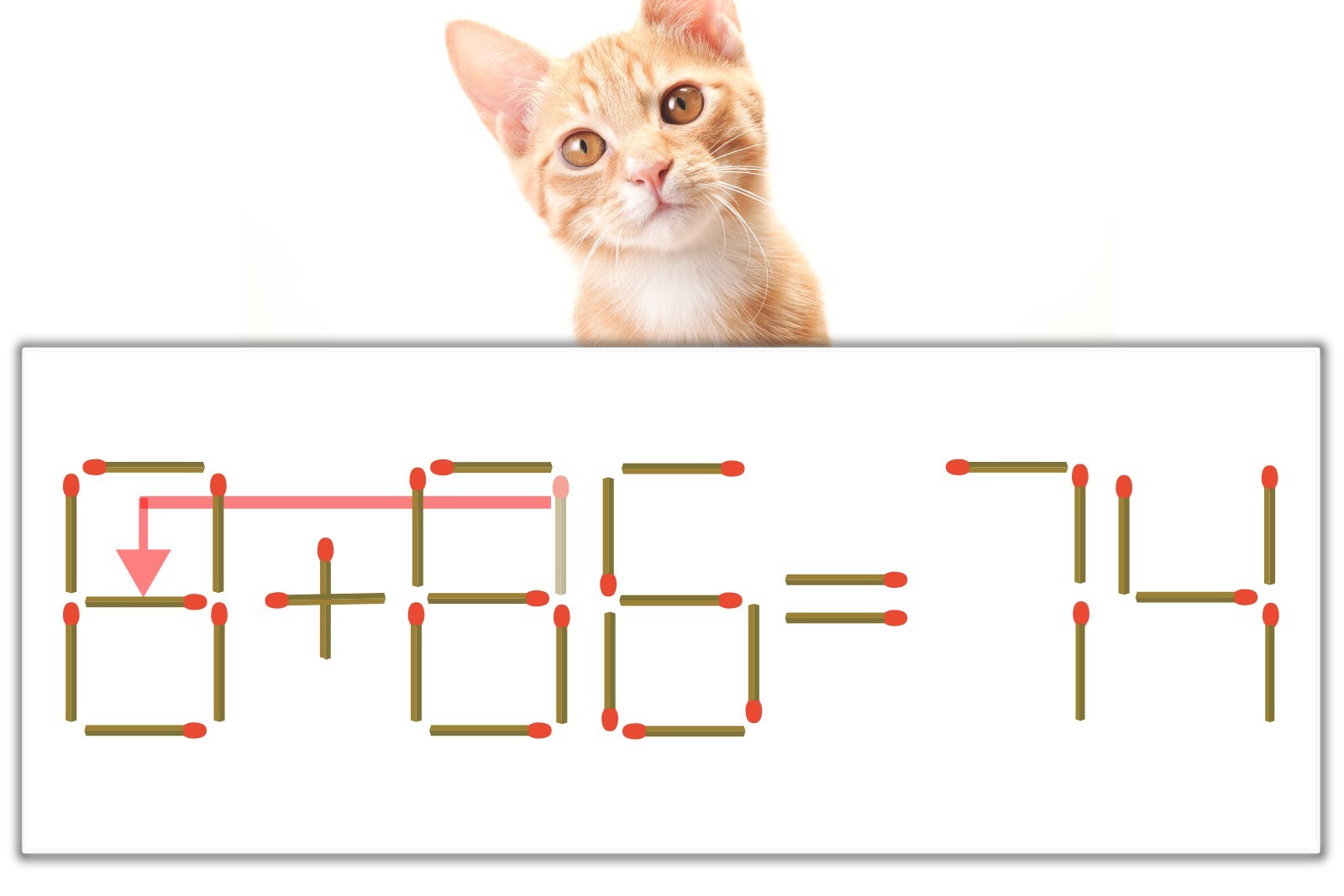 問題の「8」を別の数字に変化させると答えが導き出せます。8のマッチ棒を1本左へ移動させて、「0」を「8」にしてみましょう。すると、「8+66=74」が成立します。