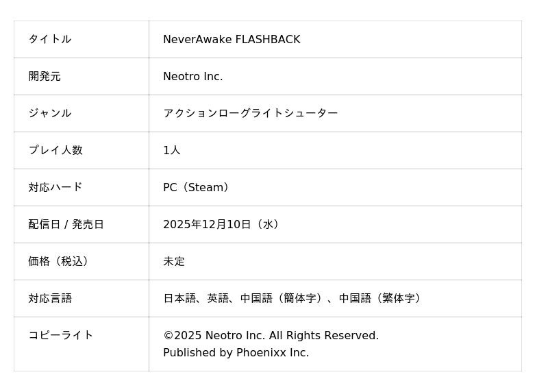 株式会社Phoenixx(フィーニックス)(東京都武蔵野市、代表取締役社長:坂本 和則)は、アクションローグライトシューター『NeverAwake FLASHBACK』をPC(Steam)向けに2025年12月10日(水)に配信決定したことをお知らせいたします。