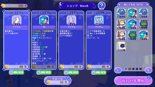 無事におばけから逃げきると、集めたゴールドでお買い物ができます。新しいぬいぐるみを仲間にできるほか、さまざまなアイテムが手に入ることも。持っていると、嬉しい効果でテテやぬいぐるみがもっと強くなります。代わりに弱点もあるので、うまく作戦と組み合わせて考えましょう。100種類以上登場するアイテムをすべて集められるでしょうか?